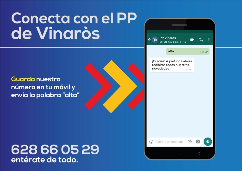 Hace pocos días alcanzamos los más de 500 suscriptores y por ello queremos dar las gracias a todos aquellos que habéis guardado el número de teléfono del PP de Vinaròs (628 660 529) y después habéis enviado la palaba “ALTA” para empezar a recibir las noticias e informaciones de interés para vosotros.