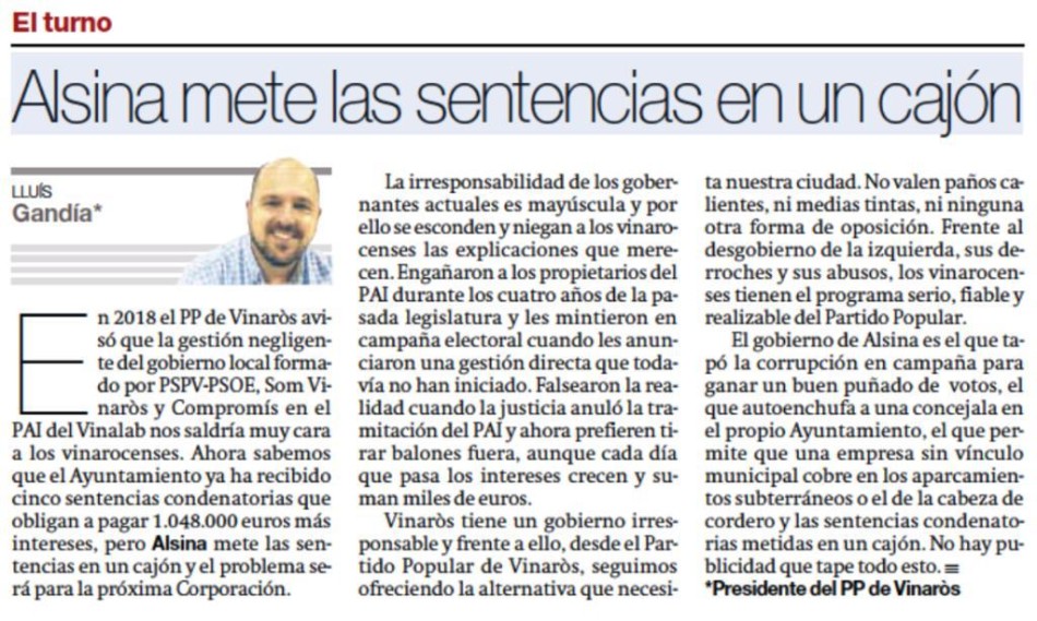 En 2018 el Partido Popular de Vinaròs avisó que la gestión negligente del gobierno local formado por PSPV-PSOE, Som Vinaròs y Compromís en el PAI del Vinalab nos saldría muy cara a los vinarocenses. Ahora sabemos que el Ayuntamiento ya ha recibido 5 sentencias condenatorias que obligan a pagar 1.048.000 euros más intereses, pero Alsina mete las sentencias en un cajón y el problema será para la próxima Corporación.
