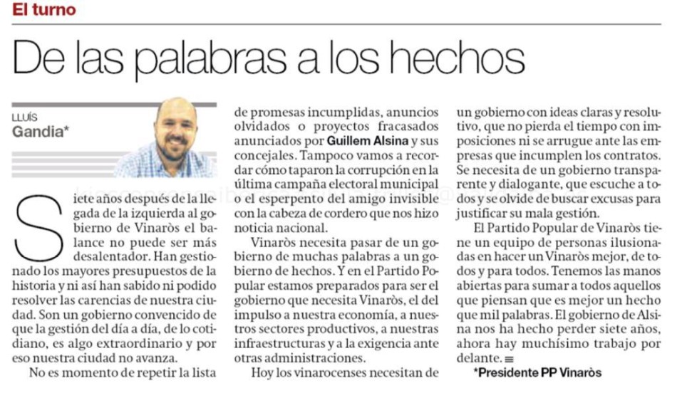 Vinaròs necesita pasar de un gobierno de muchas palabras a un gobierno de hechos. Y en el Partido Popular estamos preparados para ser el gobierno que necesita Vinaròs, el del impulso a nuestra economía, a nuestros sectores productivos, a nuestras infraestructuras y a la exigencia ante otras administraciones.