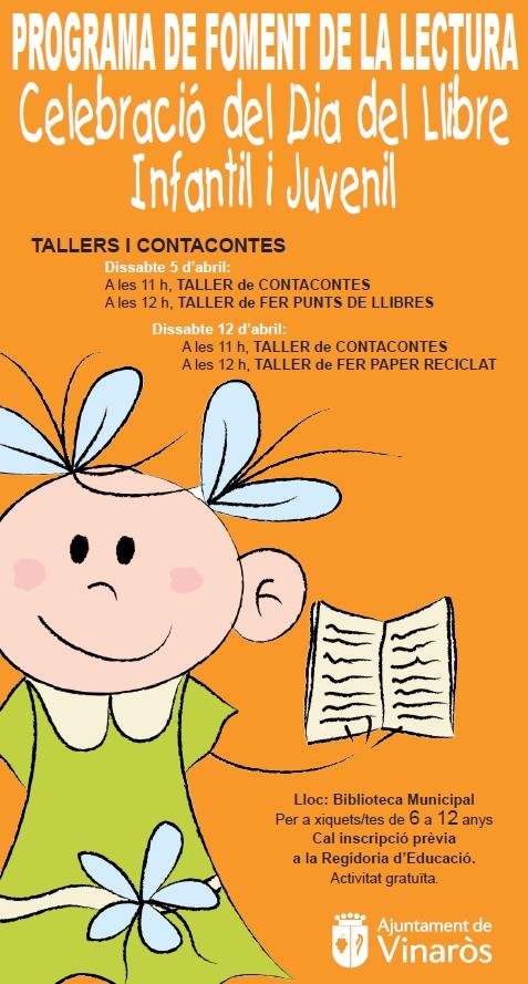 El sábado, 5 de abril, en la Biblioteca municipal y a partir de las 11 horas se realizará un cuentacuentos y a las 12 horas un taller para hacer puntos de libro. El sábado, 12 de abril, a las 11 horas se realizará otro cuentacuentos y a las 12 un taller donde se enseñará a elaborar papel reciclado. Las actividades están dirigidas a niños y niñas de 6 a 12 años.