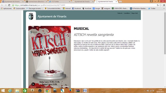 El sistema es similar al de cualquier punto de venta de entradas por Internet. Los ciudadanos deberán acceder a la web municipal, www.vinaros.es, y en la pestaña de Venta de Entradas seleccionar el espectáculo, la hora de la función, su butaca y realizar el pago mediante una tarjeta de crédito o débito. El sistema puesto en marcha hoy ya permite adquirir las entradas para el festival de Locura aunque Gandía señala que “desde ahora, y este mismo sistema, lo utilizaremos para la venta de los tickets de las paellas en la ermita, las verbenas de Sant Joan i Sant Pere, la festa del Llagostí, etc".