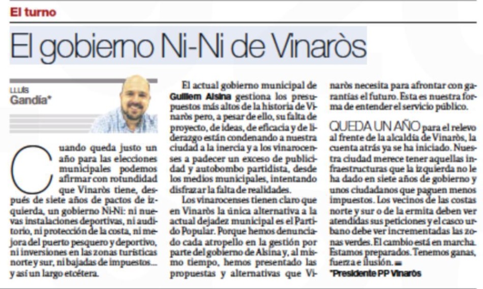 El actual gobierno municipal de Guillem Alsina gestiona los presupuestos más altos de la historia de Vinaròs pero, a pesar de ello, su falta de proyecto, de ideas, de eficacia y de liderazgo están condenando a nuestra ciudad a la inercia y a los vinarocenses a padecer un exceso de publicidad y autobombo partidista, desde los medios municipales, intentando disfrazar la falta de realidades.