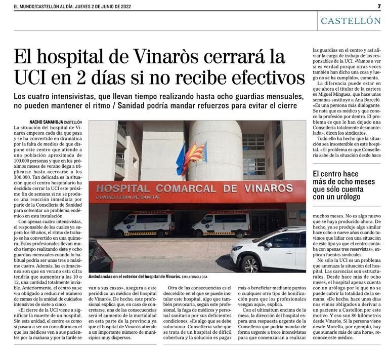 El Partido Popular de Vinaròs ha denunciado hoy en rueda de prensa de su portavoz municipal, Juan Amat, “la situación de colapso que sufre el Hospital Comarcal de Vinaròs y que lleva a los profesionales sanitarios a anunciar el cierre de la UCI en dos días si no llegan refuerzos y se soluciona la crítica situación de personal que se vive en estos momentos”.