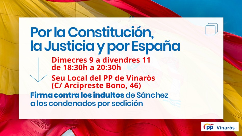 Los populares han señalado que “hacemos un llamamiento a todos los vinarocenses, independientemente de su ideología, para que firmen y muestren su oposición a que el Gobierno de todos los españoles indulte a personas condenadas en firme por delitos tan graves como la sedición y la malversación. Un gobierno no puede ni debe pactar indultos a cambio de permanecer unos meses más en el poder, y en eso estamos seguros que coincidimos una mayoría de vinarocenses”.