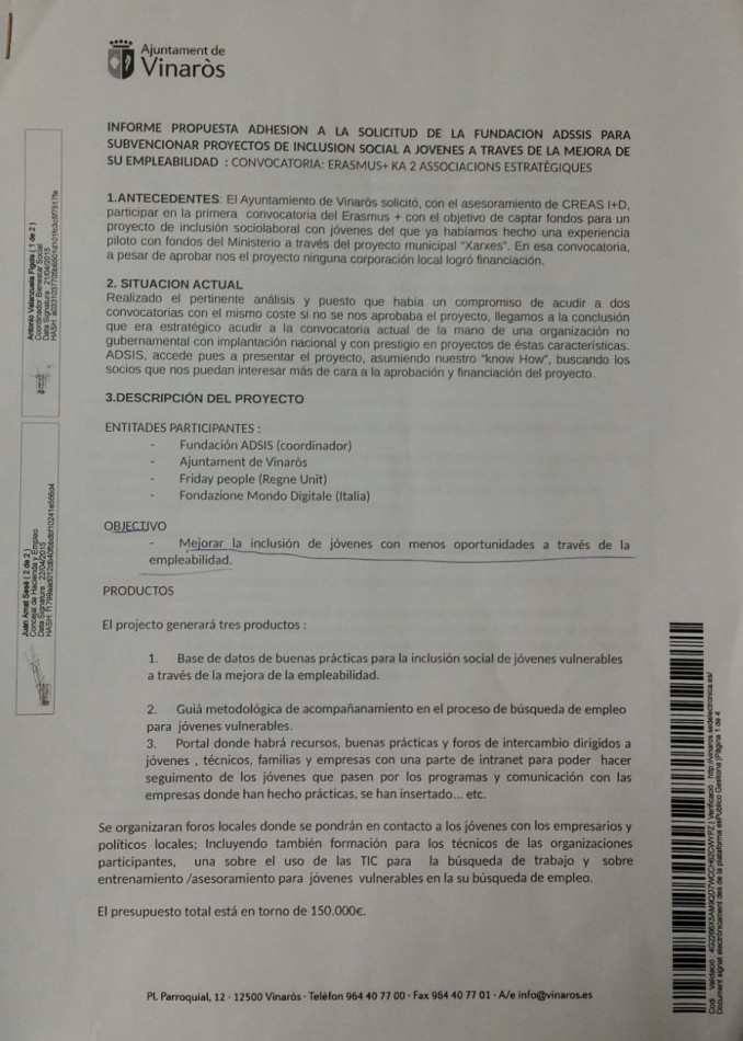 Cosa distinta es que los políticos cuando hubieran venido aquí jóvenes de Reino Unido, o Italia, junto con los de Vinaròs, participaran en los foros locales que se organizaran. Pero en modo alguno se puede decir, sin faltar a la verdad, que en la solicitud de la subvención que firmó el gobierno del PP estuviera previsto que políticos de Vinaròs viajaran a Reino Unido con cargo a fondos públicos.