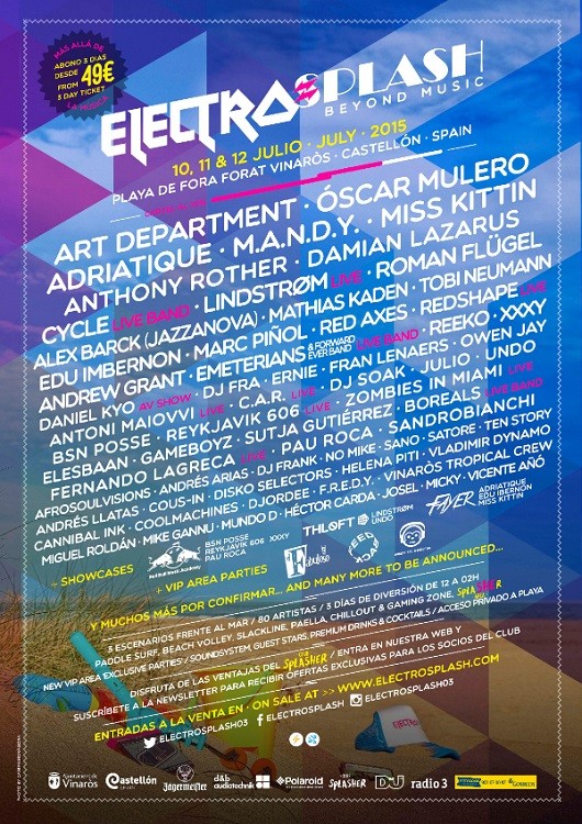 Llegan más noticias desde el Mediterráneo y es que el festival ElectroSplash confirma su tercera tanda de artistas, que durante los próximos 10, 11 y 12 de julio tomarán la playa de Fora Forat en Vinaròs, Castellón. Se trata de un total de 25 artistas, encabezados por Art Department y Óscar Mulero, seguidos de Redshape (Live), C.A.R. (Live), Antoni Maiovvi (Live), Fran Lenaers, DJ Soak, Undo, Julio, Disko Selectors, Cannibal Ink, Coolmachines, Andrés Llatas, Vinaròs Tropical Crew, No Mike, Cous-in, Vladimir Dynamo, Helena Piti, Djordee, Mike Gannu, DJ Frank, Micky, Vicente Añó, Josel y Hector Carda.