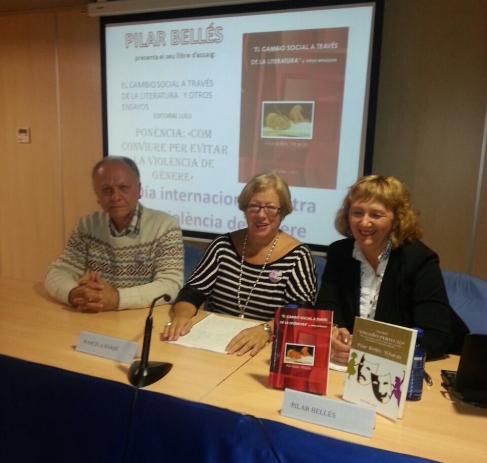 El salón de actos Providencia García de la Biblioteca municipal de Vinaròs acogió en la jornada de ayer diversos actos conmemorativos del Día mundial contra la violencia de género. La escritora de Sant Mateu, Pilar Bellés, presentó su última obra titulada “El cambio social a través de la literatura” y también la adaptación de una obra de teatro para niños y niñas de 10 años que lleva por título “Engaño perfecto”. Tras la presentación de ambas obras se realizó la conferencia “Como convivir para evitar la violencia de género. Como actuar en caso de padecerla”. Tras este acto la asociación Mi mano es tu apoyo realizó el pase del documental “No estás sola Sara”. La edil de Bienestar Social vinarocense, Marcela Barbé, destacó “el gran trabajo que realiza la asociación Mi mano es tu apoyo tanto en la concienciación como en el seguimiento de los casos así como a Pilar Bellés, una activista en defensa de la igualdad y a la que agradecemos su presencia y su dedicación”.