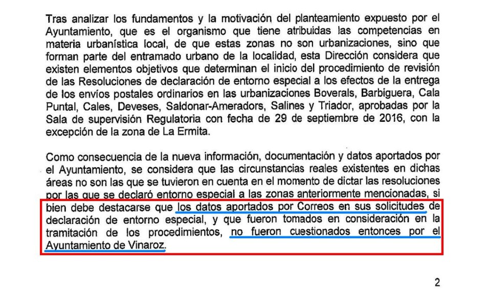 Los populares han exigido también “la dimisión de Enric Pla y Guillem Alsina por haber ocultado la información durante 16 meses a los vecinos de Vinaròs y por haber quedado demostrado que sólo su ineficacia e incompetencia provocó un recorte en el servicio de Correos que nunca debió de producirse si el Ayuntamiento hubiese actuado de forma diligente tal y como se desprende de la propia resolución de la CNMC hecha pública en el día de hoy, puesto que a la vez que revoca la decisión adoptada anteriormente, expresamente destaca que si ésta se adoptó por la CNMC fue en base a los datos aportados por correos y que no fueron discutidos por el ayuntamiento de Vinarós durante la tramitación del expediente, abierto por la CNMC en marzo de 2016”.