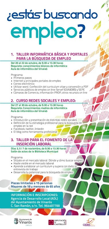 • Taller de informática básica y portales de búsqueda de empleo. Se impartirá del 20 al 22 de octubre, en horario de 9.30 a13.30 horas, en el Aula de Informática del Vinalab. Como requisito, los alumnos deben tener conocimientos básicos de informática. Se enseñará cómo dar los primeros pasos en Internet, conociendo los principales portales de empleo; uso de correo electrónico y elaboración de currículum vitae; acceso a servicios públicos de empleo, Cámaras de Comercio, PROP, etc.