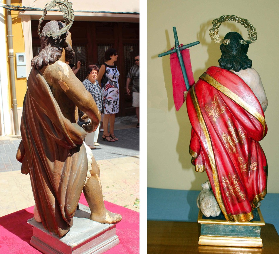 El portavoz adjunto del Partido Popular de Vinaròs, Lluís Gandía, ha señalado que “es una talla de madera esculpida a principios del siglo XIX y que presentaba un deterioro sobre todo por las innumerables capas de pintura que escondían la figura original y daban un tono mucho más oscuro a la imagen”. Las diferencias entre el antes y el desspués de la restauración resultan evidentes en las fotos que acompañan esta noticia.