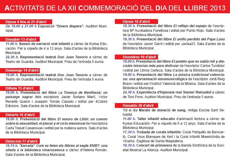El concejal de Cultura del Ayuntamiento de Vinaròs, Lluís Gandía, ha presentado las actividades que desde la Biblioteca municipal se han organizado para la Fira del Llibre 2013 y que tendrá su punto álgido el domingo 21 de abril con la gran feria en la plaza de La Mera.