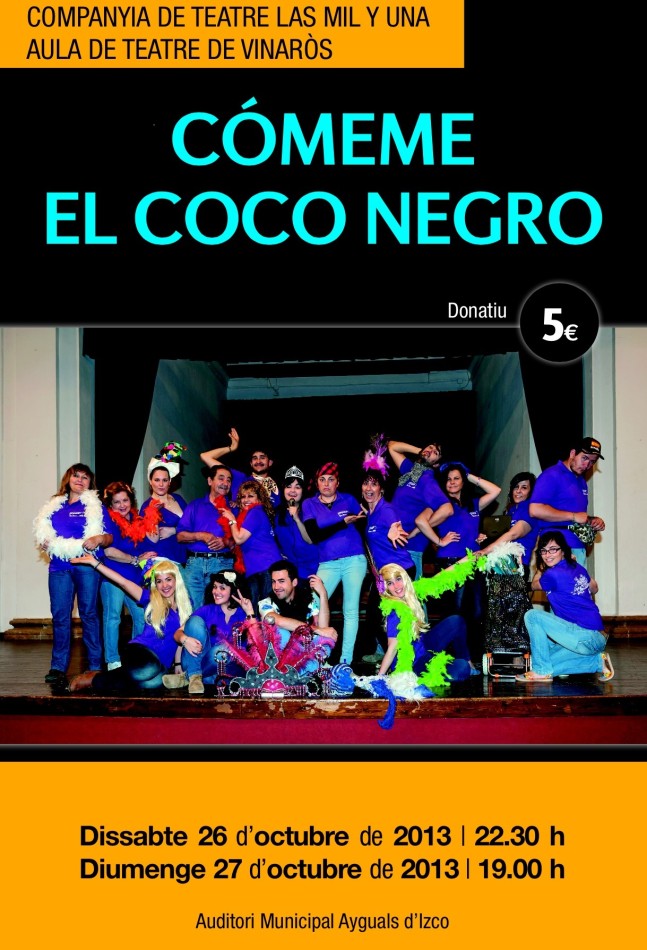 Continuando con la programación teatral el siguiente fin de semana el Aula Municipal de Teatre ha programado dos nuevas representaciones de la obra “Cómeme el coco, negro” tras el éxito del mes de junio donde 1.200 personas pasaron por el Auditorio. Las funciones serán el sábado, 26 de octubre, a las 22:30 horas y el domingo, 27 de octubre a las 19:00 horas.