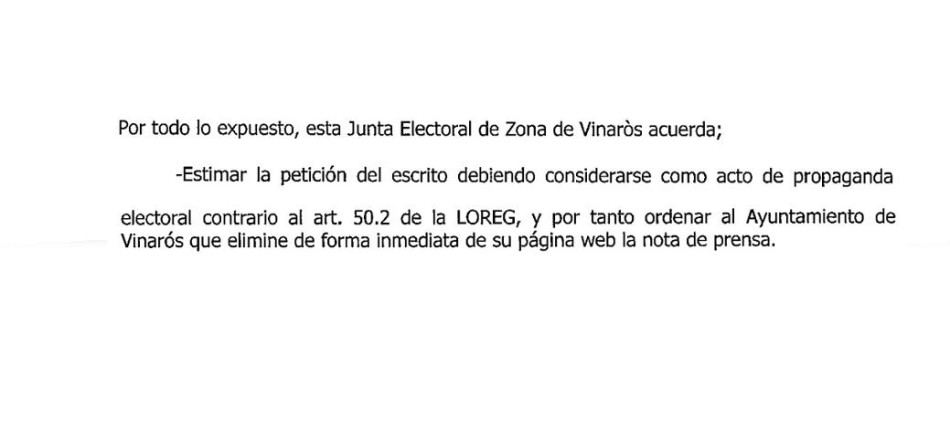 El tripartito de Vinaròs, formado por Podemos, PSOE y Compromís ha vulneradola Ley Electoralal realizar un balance propagandístico en periodo electoral tal y como ha acordadola Junta Electoralen su resolución.