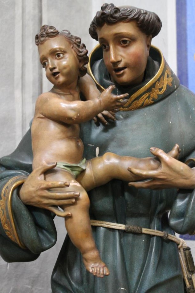 Esta escultura constituye una espléndida imagen devocional que representa a San Antonio de Padua con el Niño Jesús en brazos. La talla muestra al santo con una expresión dulce de arrobo místico sobre una base de nubes en la que aparecen un buen número de ángeles. La ejecución y los modelos de la obra remiten directamente a la escultura académica valenciana, y recuerdan muy de cerca la producción de algunos autores como José Esteve Bonet o Ignacio Vergara, por lo que su fecha de ejecución debe de situarse a finales del siglo XVIII.