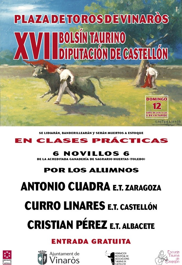 El acto cuenta con el atractivo añadido de que uno de los novilleros participantes es el vinarocense Curro Linares, alumno de la Escuela Taurina de Castellón. Le acompañarán en la terna Antonio Cuadra, de la Escuela Taurina de Zaragoza y Cristian Pérez, de la Escuela Taurina de Albacete. Se lidiarán novillos de la ganadería de Sagrario Huertas. El Bolsín comenzará a las 18.00 horas y se podrá acceder de forma totalmente gratuita.