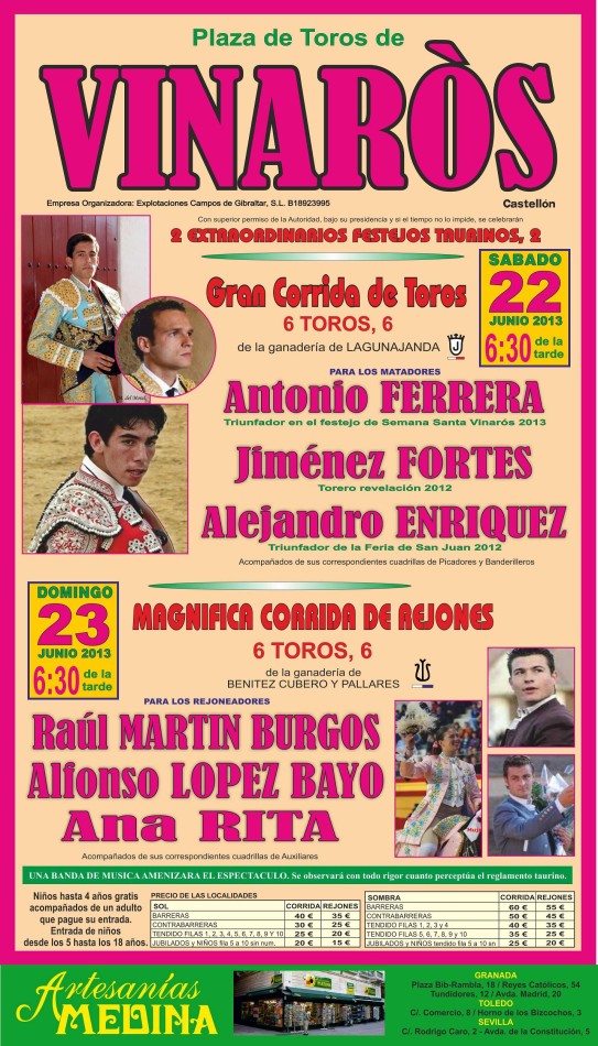 El próximo sábado 22 de junio a las 18:30 horas, y con toros de la ganadería de Lagunajanda, el cartel estará formado por Antonio Ferrera, triunfador del festejo de Semana Santa; Jiménez Fortes, torero revelación de la pasada temporada y Alejandro Enriquez, triunfador de la pasada Feria de San Juan y San Pedro 2012.