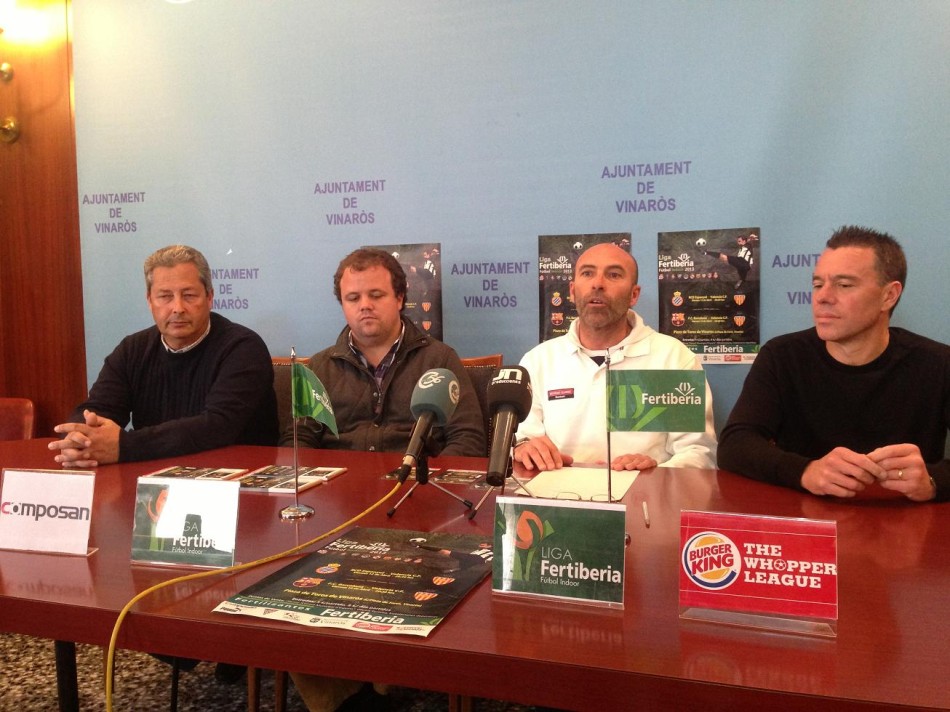 El salón de plenos del Ayuntamiento de Vinaròs ha sido el escenario elegido para presentar ante los medios de comunicación los dos partidos de futbol indoor de la liga nacional fertiberia que se van a llevar a cabo en la plaza de toros municipal de Vinaròs los viernes 12 i 19 de abril.