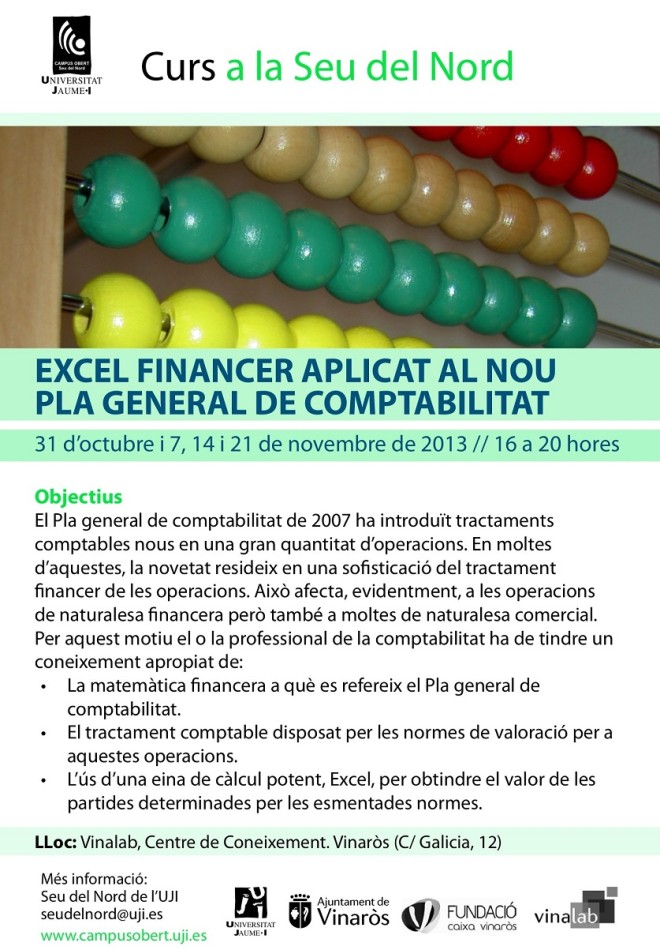 De esta forma el próximo 31 de octubre dará comienzo un nuevo curso de excel aplicado al nuevo plan general de contabilidad con una duración de 16 horas y que como novedad se impartirá en el centro de conocimiento, Vinalab.