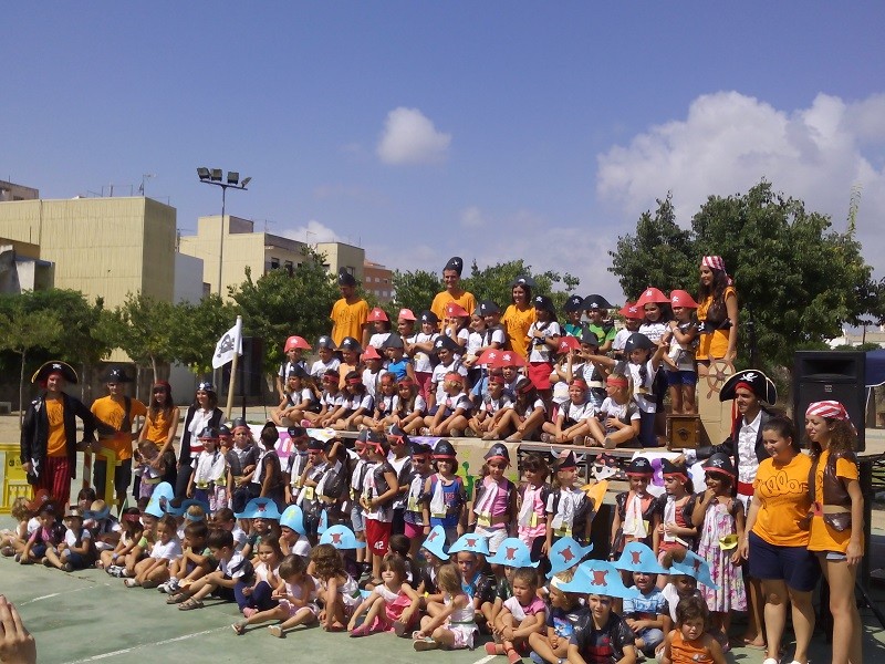 Como se ha indicado anteriormente durante eel mes de agosto la temática se ha basado en el mundo pirata con una gran gincana además de elaborar sus propios disfraces con los complementos correspondientes como espada, gorro, cinturón y chaleco. Además han realizado juegos de interior y exterior tematizados, manualidades, cuentacuentos, etc… y lo más esperado, jueves y viernes fiesta de agua.