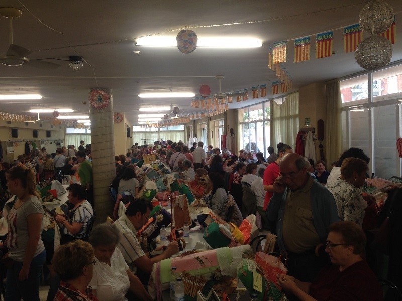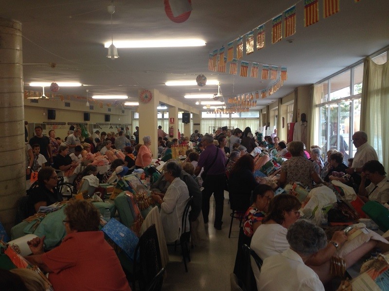 El salón principal del centro municipal presentaba un aspecto colorista con decenas de bolilleras trabajando en sus obras de arte.