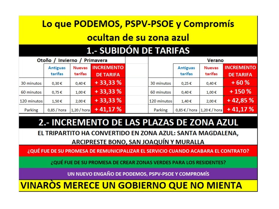 Estamos ante una nueva tomadura de pelo por parte de Podemos, PSPV-PSOE y Compromís que vuelven a quedar retratados en Vinaròs por su enésimo incumplimiento. No ha habido remunicipalización de la zona azul, no ha habido zona verde para residentes y sí en cambio crean más plazas de zona azul de las que se encontraron al llegar y ponen los precios más caros de la historia de Vinaròs en todo aparcamiento en calle que supere los 15 minutos de duración, que son la inmensa mayoría.