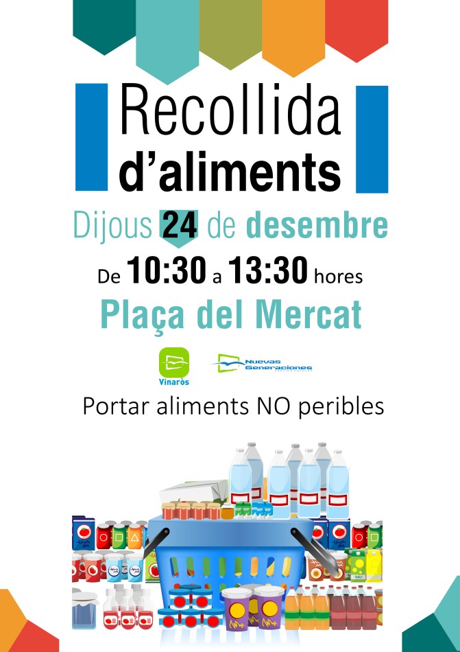Nuevas Generaciones del Partido Popular de Vinaròs organizan por quinto año consecutivo una recogida de alimentos que tendrá lugar el próximo jueves, 24 de diciembre, en la plaza del Mercado desde las 10:30 horas y hasta las 13:30 horas.