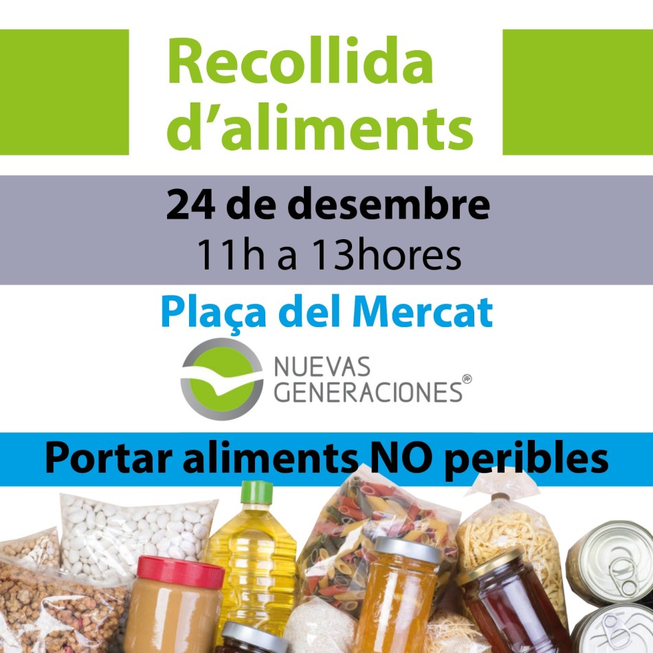 Nuevas Generaciones del Partido Popular de Vinaròs llevará a cabo este próximo lunes, 24 de diciembre, la octava edición de la recogida de alimentos no perecederos y que se desarrollará en la plaza San AgustÃn de 11 a 13 horas.