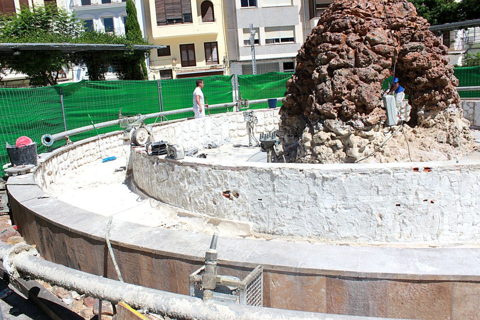 Desde hacía tiempo se había detectado una fuga de agua en la fuente que provocaba las consiguientes goteras en el parquin subterráneo, por lo que se ha actuado en la reparación general de la fuente, procediendo a la impermeabilización total, retirando todas las placas de mármol que serán repuestas una vez se compruebe debidamente la estanqueidad de la fuente.