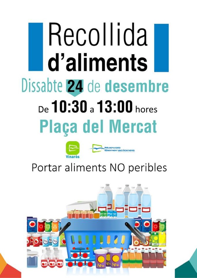 Nuevas Generaciones del Partido Popular de Vinaròs saldrá a la calle de nuevo y por sexto año consecutivo para realizar una recogida de alimentos no perecederos que serán entregados a Caritas Vinaròs. La cita, como viene siendo habitual en las últimas tres convocatorias, es la mañana del 24 de diciembre desde las 10:30 horas y hasta las 13:00 horas en la Plaza del Mercado.