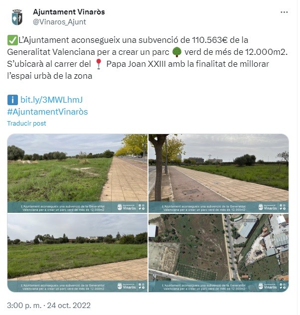 Recordarán los vinarocenses que en el mes de octubre de 2022 el gobierno de Alsina anunció en rueda de prensa la obtención de una subvención de la Generalitat Valenciana para transformar en una gran zona verde la situada en la avenida de Juan XXIII frente a la ITV. Alsina anunció a bombo y platillo que Vinaròs tendría un nuevo pulmón verde, la zona verde más grande del municipio.
