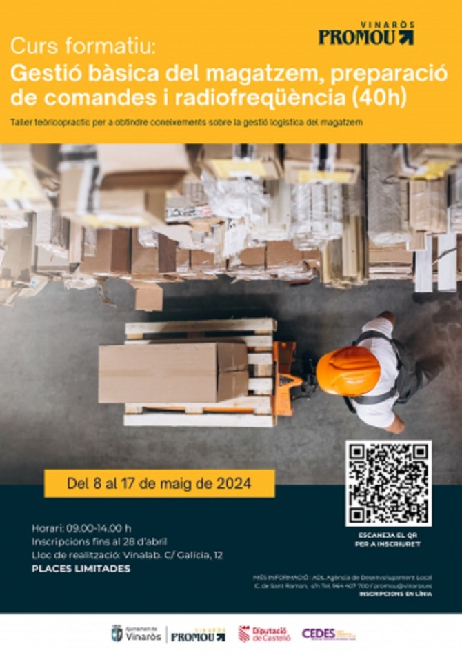 El primer curso es “Gestión básica del almacén, preparación de pedidos y radiofrecuencia” con una duración de 40 horas, que se impartirá del 8 al 17 de mayo en el Centre del Coneixement del Vinalab. Las inscripciones se pueden realizar hasta el 28 de abril, con un máximo de 15 alumnos. El segundo curso es “Monitor/a de escuela tempranera”, con una duración de 30 horas, que se impartirá del 22 al 29 de mayo también en el Centre del Coneixement del Vinalab. Las inscripciones se pueden realizar del 22 de abril al 12 de mayo, con un máximo de 15 participantes.