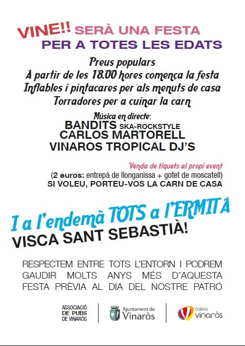 La fiesta, por tercer año consecutivo comenzará el día anterior, domingo 19 de enero, en la carpa del Atlántico a partir de las 18 horas donde se organizarán atracciones gratuitas para los más pequeños y música en directo con el grupo Bandits, Vinaròs Tropical y Dj’s Carlos Martorell en lo que será el III Llangonissa festival. Para el evento se habilitarán puntos de fuego para que la gente pueda torrar la carne que lleve de su casa o comprarla allí. El tíquet de 2 euros dará derecho a un bocadillo de “llangonissa” y un vaso de moscatell. El III Llangonissa festival cuenta con la colaboración de la Asociación de Pubs y de la Fundació Caixa Vinaròs.