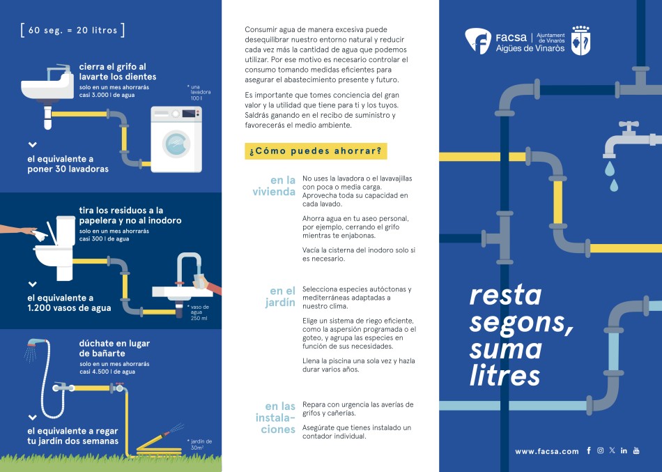 La Regidoria de Medi Ambient, en colaboración con la empresa FACSA, ha puesto en marcha la campaña “Resta segundos, suma litros” para concienciar a la ciudadanía sobre el consumo responsable del agua. Hay que destacar que en los últimos meses se ha producido una importante escasez de lluvias en la comarca y desde el Gobierno Municipal se ha decidido iniciar esta iniciativa como medida preventiva.